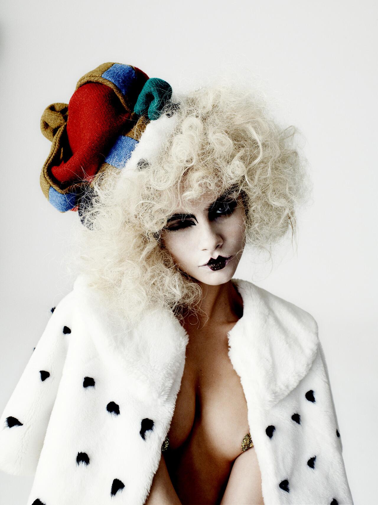just screams Elizabethan. The hair would be a wig piece, styled in curls and then back combed to create this frizzy look. The look has contemporary aspects to it. For